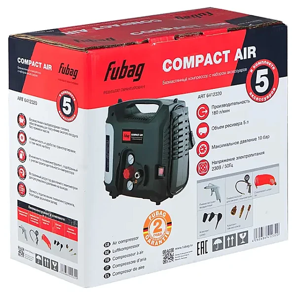Купить Безмасляный компрессор FUBAG Compact Air + набор из 5 предметов в Сургуте легко — просто позвоните по телефону: 8-800-551-11-01