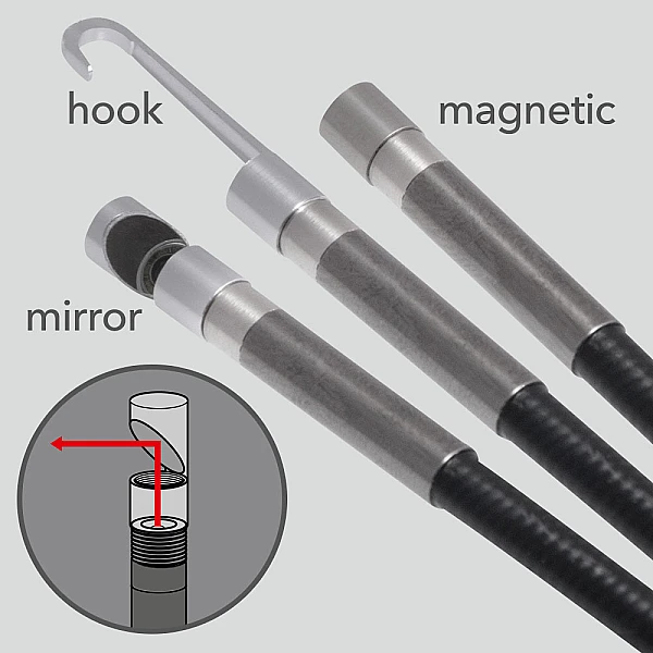 Мини-видеоскоп BO22 позволяет удобно осматривать области, которые обычно были бы полностью недоступны. Мелкие кусочки и детали, которые вы случайно уронили в моторный отсек или другие части машин, к которым трудно получить доступ, теперь можно легко извлечь с помощью легко монтируемого крючка или магнитного крепления.