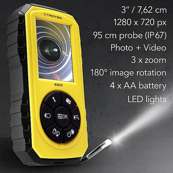 Идеально подходит для менеджеров объектов, технических специалистов или частных пользователей. Если требуется быстрый и надежный эндоскопический визуальный осмотр, BO22 является идеальным помощником. Независимо от того, хотите ли вы осмотреть внутренние детали машины или получить представление о пустотах, доступ к которым возможен только через небольшие отверстия: благодаря небольшому и полужесткому зонду с гусиной шеей с мини-камерой диаметром всего 5,5 мм устройство идеально подходит для осмотров автомобилей и для выявления плохо видимых узких пространств, таких как зазоры, дренажные трубы, трубы или кабельные каналы. Гибкий полужесткий зонд с гусиной шеей длиной 95 см можно вставлять в небольшие отверстия. Свет, обеспечиваемый 6 светодиодами, регулируется в четыре этапа и идеально освещает окружающую среду, обеспечивая высококачественные изображения для осмотра, даже в воде. Цветной ЖК-дисплей обеспечивает четкие фотографии и видео с разрешением 1280 x 720 пикселей. 3х-кратный зум увеличивает изображение. Полезная функция поворота изображения позволяет поворачивать изображение на 180° и облегчает просмотр на дисплее.