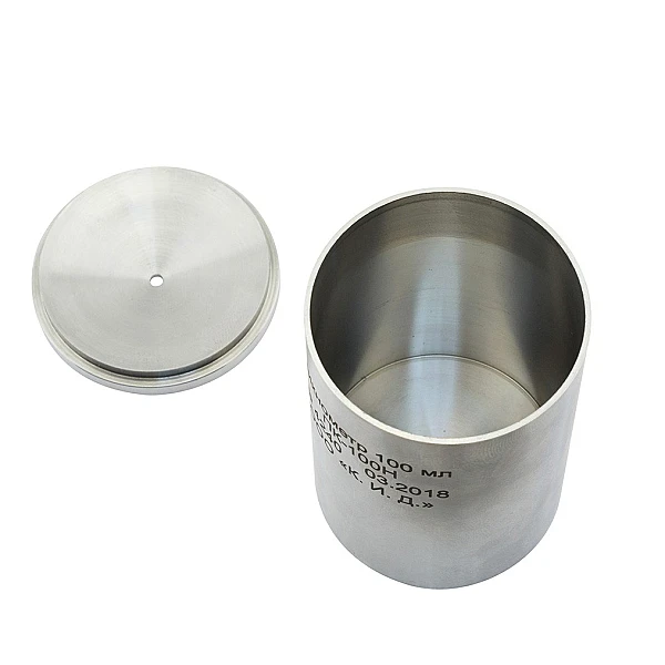 Пикнометр емкостью 100 мл., изготовленный из нержавеющей стали, представляет собой стакан с притертой крышкой, на которой имеется отверстие для выпуска излишков испытуемого материала. Пикнометр изготавливается из твердого алюминиевого сплава с низким коэффициентом температурного расширения.