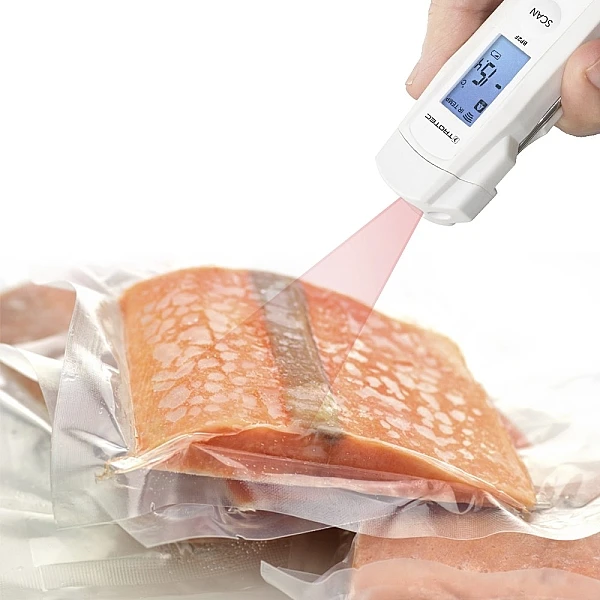 Вы можете использовать компактный BP2F для быстрого определения температуры поверхности пищевых продуктов с помощью бесконтактного инфракрасного измерения, что особенно удобно для быстрого и надежного сканирования температуры поступающих товаров или при проверках большого количества пищевых продуктов. На расстоянии 10 см от измеряемого объекта диаметр пятна измерения составляет 25 мм. Если измеренные значения выходят за пределы допустимых значений или вы также хотите определить температуру внутри объекта, вы можете дополнительно использовать складной проникающий зонд из нержавеющей стали для контроля температуры. Когда зонд не используется, его можно просто сложить в ручку и заблокировать. Таким образом, компактное комбинированное устройство можно безопасно хранить даже в самом маленьком кармане. Точные результаты измерений и простота в обращении: при открытии зонда BP2F автоматически активируется, а инфракрасное измерение начинается сразу после нажатия кнопки. Поскольку управление интуитивно понятно, прибор можно использовать на практике без особых инструкций. Все измеренные значения температуры четко видны, так как они отображаются большими цифрами на подсвеченном дисплее. Кроме того, функция сигнализации для заранее заданных предельных значений максимальной и минимальной температуры позволяет быстро и точно использовать измерительное устройство для ваших индивидуальных потребностей. Благодаря прочному моющемуся корпусу со степенью защиты IP65, BP2F является надежным решением для контроля температуры пищевых продуктов в соответствии со стандартом HACCP, применяемым производителями, а также в торговле, транспортировке и сфере общественного питания.