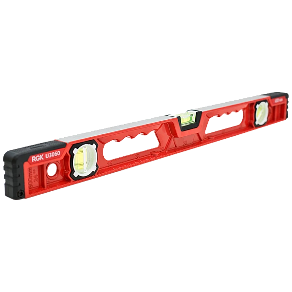 Магнитный уровень RGK U3060 длиной 60 сантиметров выполнен в прочном металлическом корпусе из литого профиля с резиновыми насадками, поэтому вы можете выравнивать поверхность ударами молотка непосредственно по уровню.