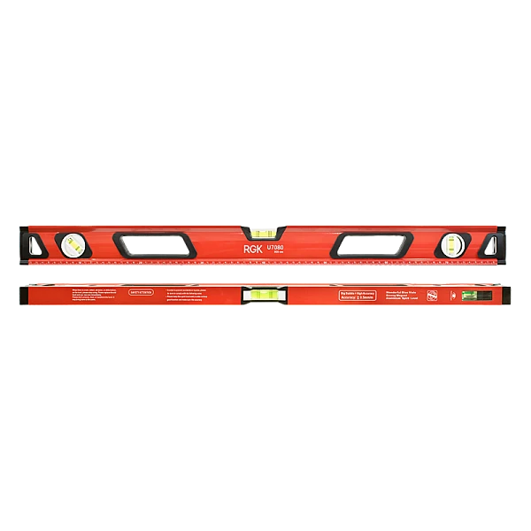 На узком верхнем ребре уровня RGK U7080 находится окошко, в котором с помощью системы зеркал отображается положение пузырька вертикального уровня. Благодаря этому, удобно контролировать вертикальные поверхности в узких нишах и в прочих труднодоступных местах.