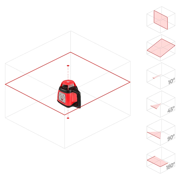Режим сканирования доступен в пяти возможных уровнях: 0°, 10°, 45°, 90° и 180°. Это даёт возможность использовать лазерный уровень RGK SP-100 на отдельном участке строительной площадке, не создавая посторонних помех или опасности для окружающих.