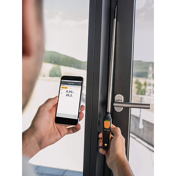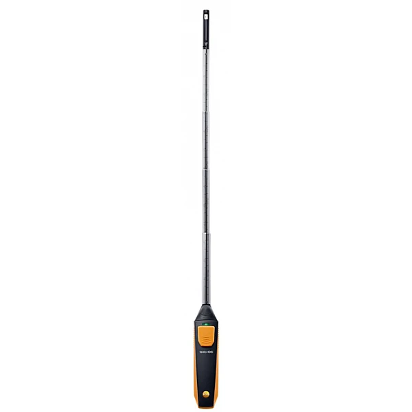 Беспроводной зонд Testo Smart Probes основан на обогреваемой струне и NTC-датчике. Устройство может с высокой точностью определить скорость и температуру потока воздуха, а также, при вводе в приложение геометрический параметров воздуховода, рассчитать объемный расход.