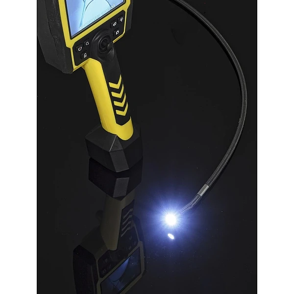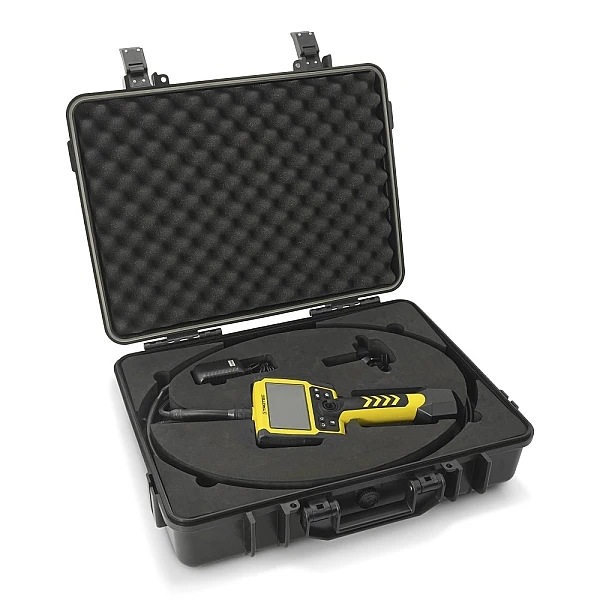 Этот профессиональный промышленный видеоскоп превращает непрямой визуальный осмотр в простое упражнение. Никаких кабелей и футляра - ничего, кроме превосходного качества изображения в прочном и легком компактном устройстве. При весе всего 400 г портативный блок управления легко позволяет выполнять длительные работы без утомления. Его зонд, изгибающийся во все стороны, может плавно управляться с помощью джойстика, а его головка камеры с титановым покрытием обеспечивает идеальный панорамный вид на зону контроля.